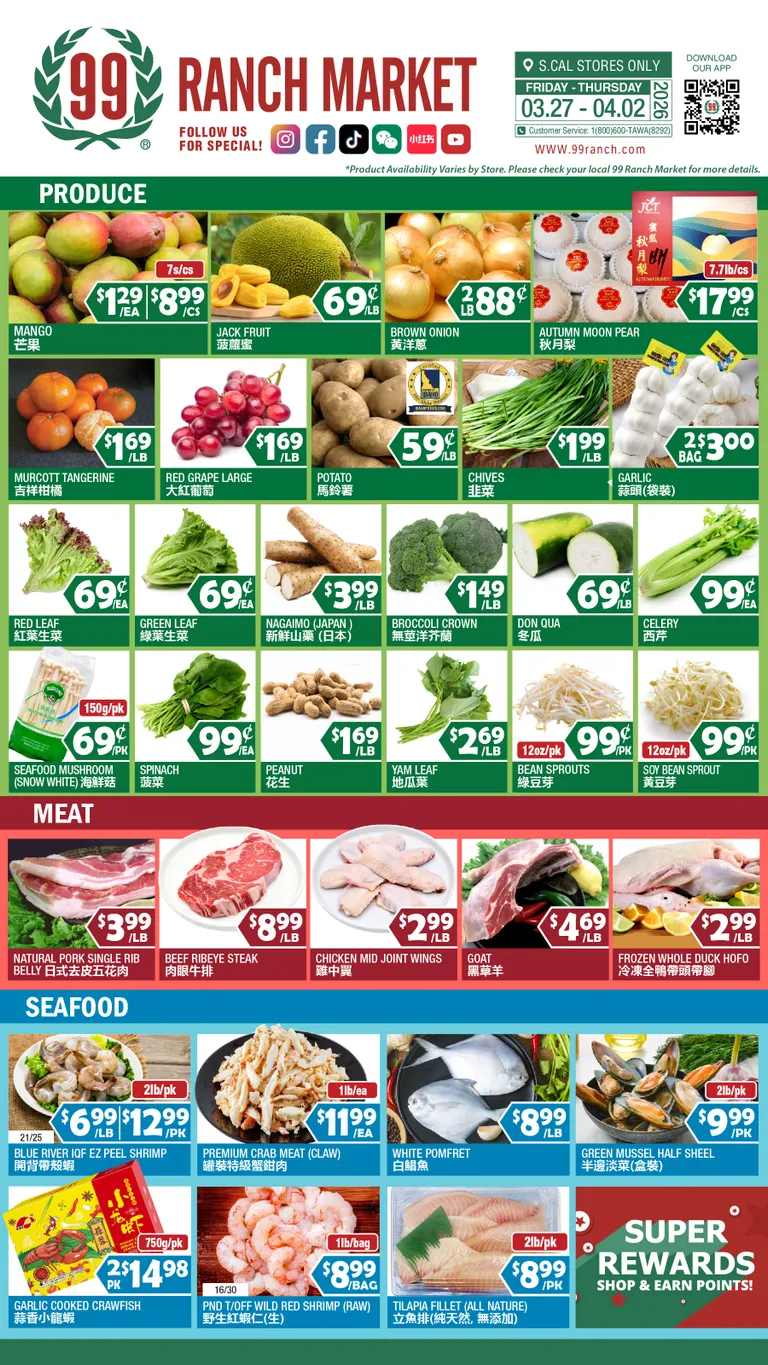 You’re viewing the 99 Ranch Market weekly ad, valid from 03/27/2026 to 04/02/2026. Visit our website regularly to stay up to date with the latest deals and promotions from your favorite stores.