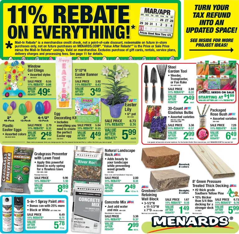 You’re viewing the Menards weekly ad, valid from 03/26/2026 to 04/05/2026. Visit our website regularly to stay up to date with the latest deals and promotions from your favorite stores.
