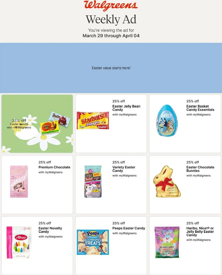You’re viewing the Walgreens weekly ad, valid from 03/29/2026 to 04/04/2026. Visit our website regularly to stay up to date with the latest deals and promotions from your favorite stores.